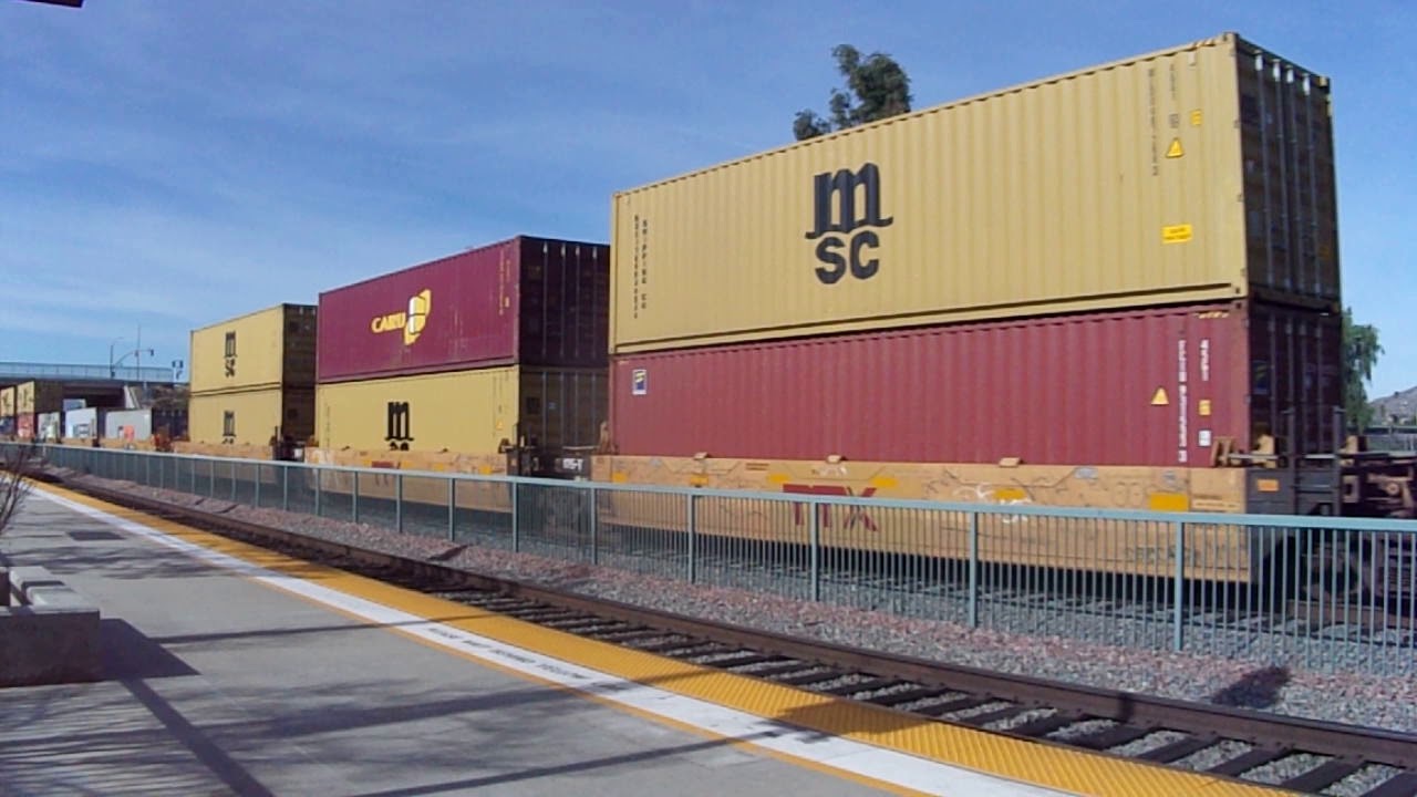 ENORMOUS 15 000 FT HIGH SPEED BNSF Intermodal Double Stack Freight Trains In The California Desert 1
