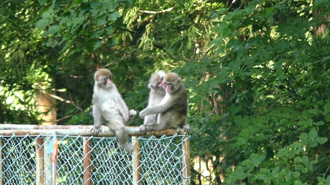 Mischievous Trio Of Japanese Monkey Frolicking Along Fence