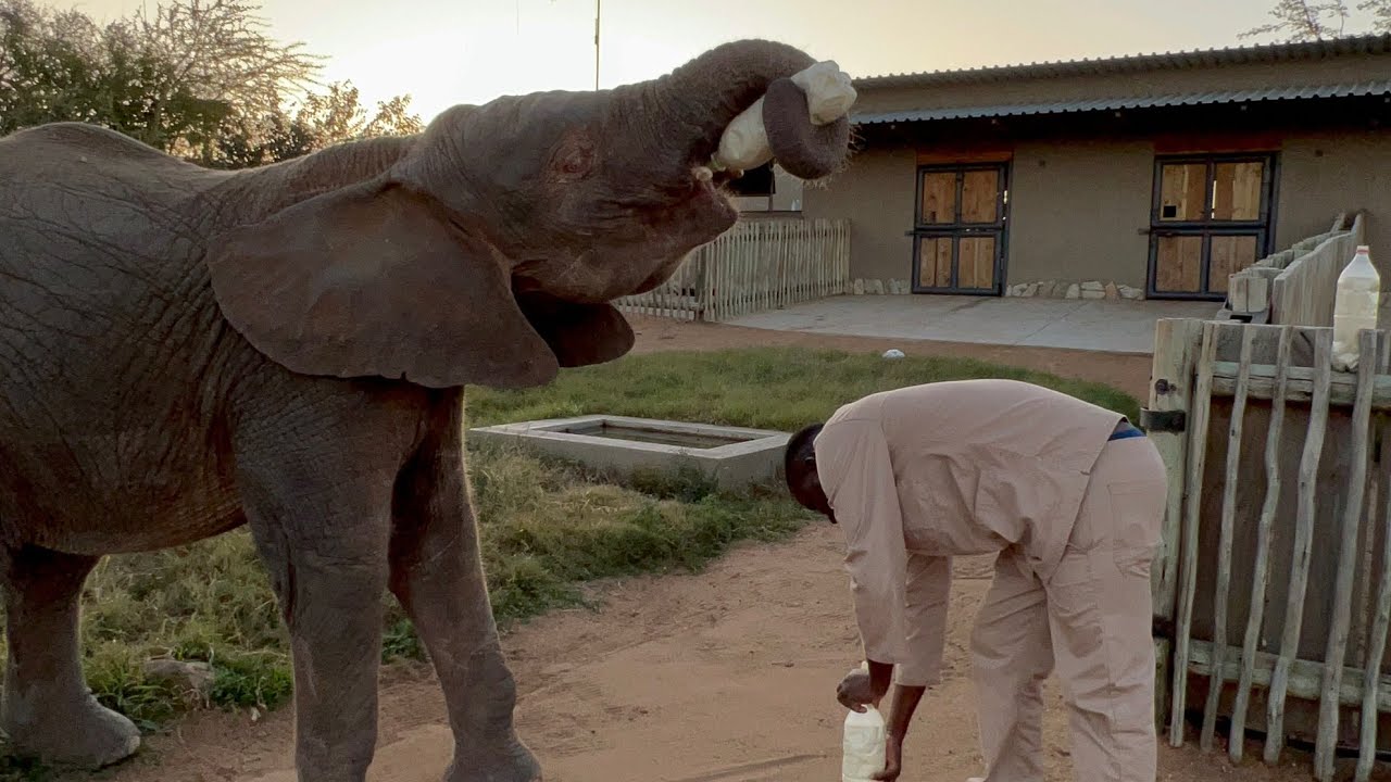 An Amazing Moment As Baby Elephant Khanyisa Runs Home For Her Milk Bottle Feeds Herself